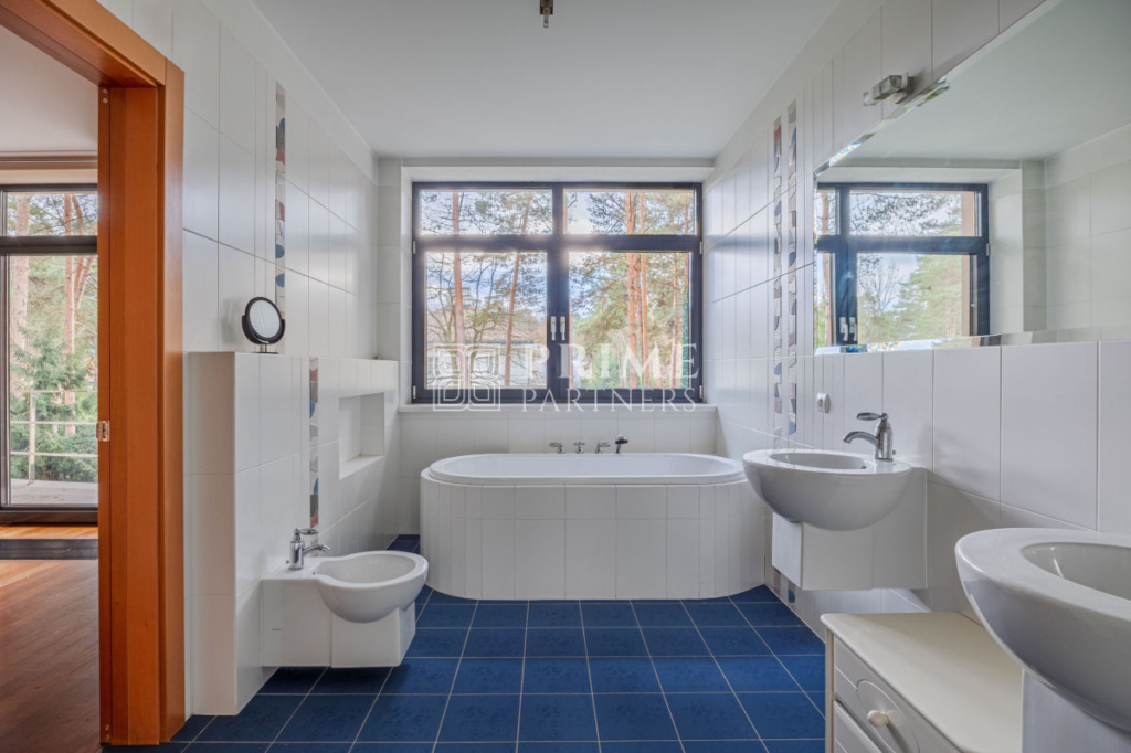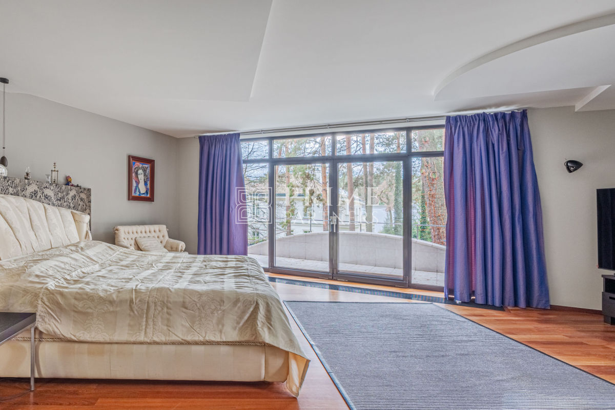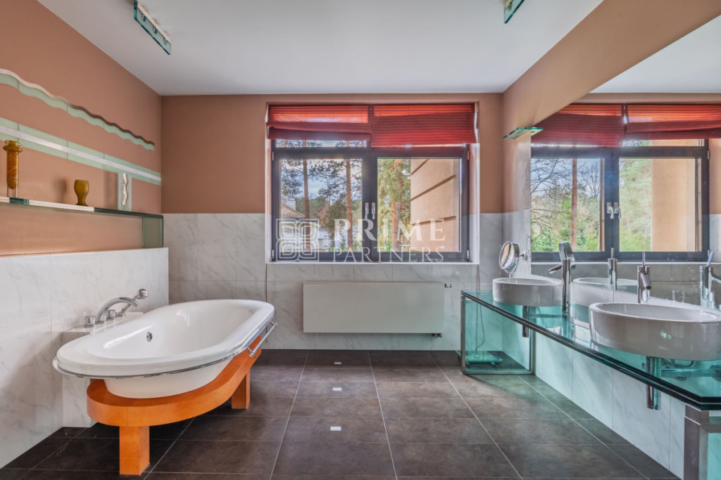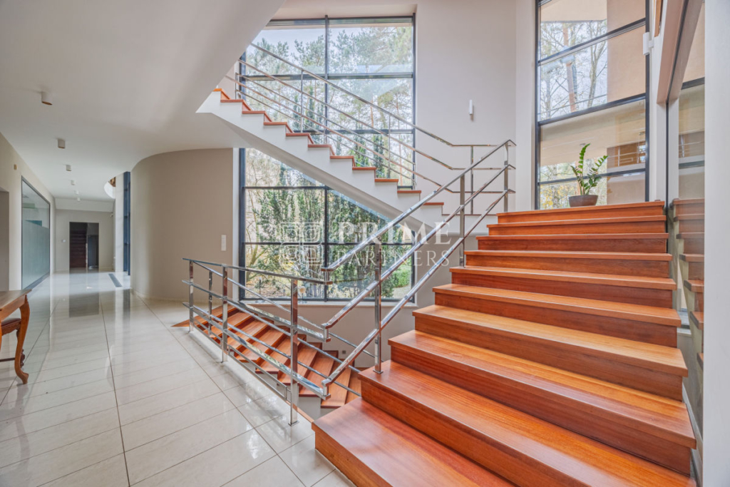 Ta luksusowa rezydencja powstała z najwyższej klasy materiałów, łącząc estetykę z funkcjonalnością. Wysokie sufity podkreślają poczucie przestrzeni i dodają wnętrzom wyjątkowego charakteru, a duże przeszklenia zapewniają obfite naturalne światło, które wprowadza do domu ciepło i harmonię. Wnętrza zachwycają perfekcyjną stolarką, która nadaje im unikalny styl i elegancki charakter. Aby zapewnić mieszkańcom pełen komfort, w domu zamontowano nowoczesną klimatyzację, umożliwiającą utrzymanie idealnego klimatu niezależnie od pory roku.